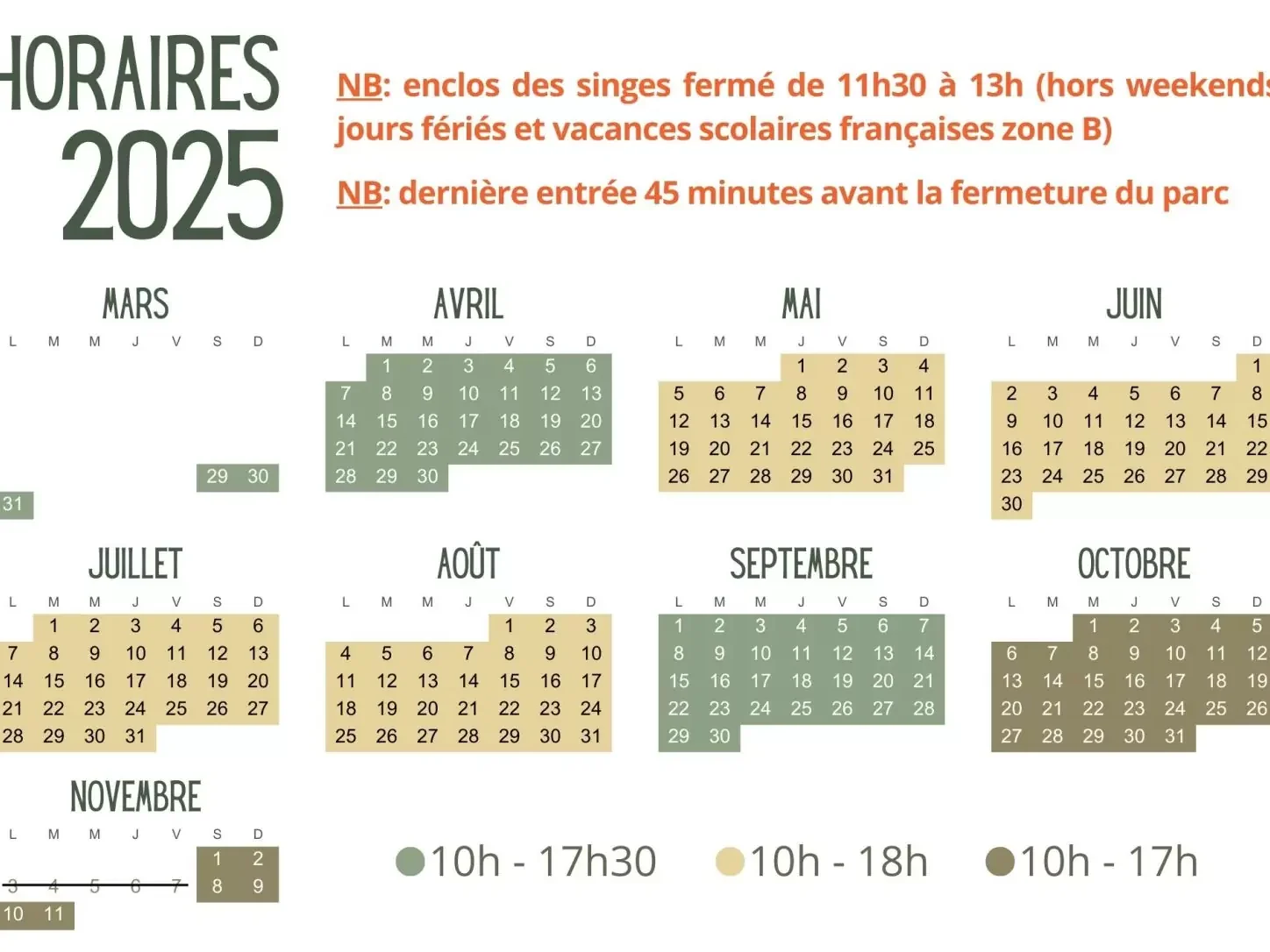 La Montagne des singes est fermée les mois de décembre, janvier et février. Le reste de l’année, le parc est ouvert quel que soit le temps.